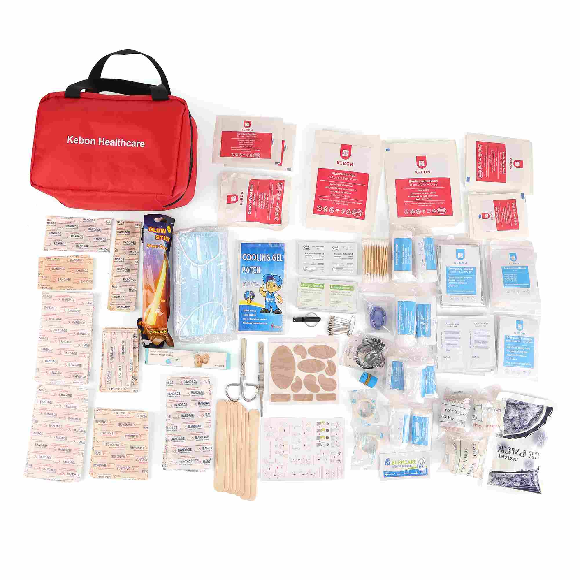 ক্যাটাগরি আইটেম অন্তর্ভুক্ত জীবাণুমুক্ত ড্রেসিংস গজ প্যাড, জীবাণুমুক্ত ক্ষত ড্রেসিং, শোষক প্যাড ব্যান্ডেজ এবং মোড়ানো ইলাস্টিক ব্যান্ডেজ, ত্রিভুজ ব্যান্ডেজ, আঠালো টেপ ওয়াউন্ড কেয়ারমিক্সড আঠালো ব্যান্ডেজ, অ্যালকোহল প্যাড, ক্লিনিং ওয়াইপস, জরুরী সরঞ্জাম, সুরক্ষা সরঞ্জাম গ্লাভস অন্যান্য প্রয়োজনীয় জিনিস তাত্ক্ষণিক আইস প্যাক, মেডিকেল টেপ, ক্ষত প্লাস্টার শীট